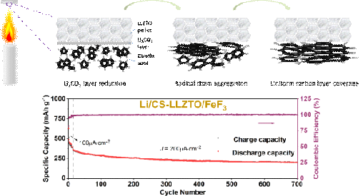 該團隊提出“燭焰(candle soot)燒烤陶瓷”模式改性LLZO/Li界面的策略,顯著剪薄了陶瓷表面的鈍化層,實現(xiàn)了“轉(zhuǎn)換型”鋰氟化物固態(tài)電池的超長可逆循環(huán)。LLZO在與空氣接觸后,易與空氣中的水和二氧化碳反應(yīng),在表面形成包含LiOH和Li2CO3的鈍化層,這一鈍化層嚴(yán)重影響了Li與LLZO的接觸,阻斷了界面處的鋰離子傳輸通道,導(dǎo)致電池的界面阻抗過大,電池性能嚴(yán)重受限。因此,鈍化層的去除是目前LLZO/Li界面改性研究的重要方向之一。在此背景下,該團隊提出一種簡易的蠟燭火焰氣相沉積手段,在蠟燭燃燒產(chǎn)生的高溫環(huán)境下,LLZO表面的Li2CO3鈍化層可以被表面沉積的蠟燭煤煙還原,具有多晶石墨化結(jié)構(gòu)的煤煙炭黑層在鋰化后可生成LiC6晶域,具有離子/電子混合導(dǎo)電性,有利于鋰離子流在界面中間層的高通量傳輸。這種界面改性后的Li/CS-LLZO/FeF3固態(tài)電池表現(xiàn)出優(yōu)異的長循環(huán)和倍率性能,其初始可逆容量可達500 mAh·g-1,循環(huán)壽命長達至少1500圈,在200 μA·cm-2電流密度下循環(huán)700圈后的可逆容量依然維持在201.0 mAh·g-1。陶瓷基固態(tài)Li-FeF3電池的循環(huán)性能甚至可超過文獻報道的液態(tài)Li-FeF3體系。相關(guān)成果發(fā)表于ACS Applied Materials & Interfaces。